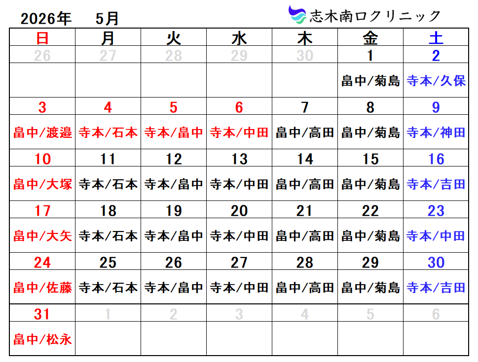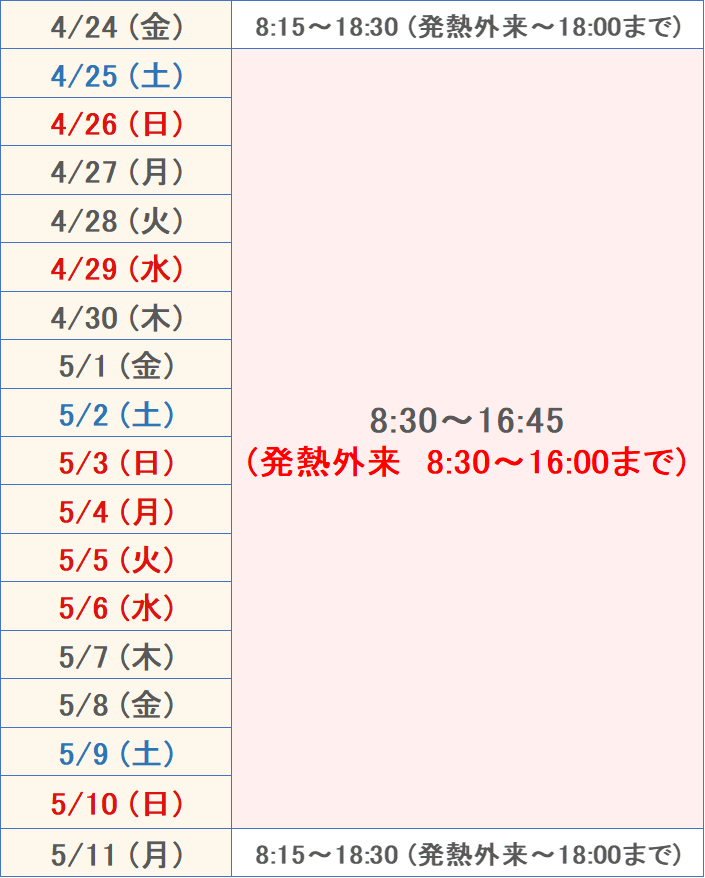 ゴールデンウィーク期間中の診療体制につきまして、下記の通りご案内申し上げます。